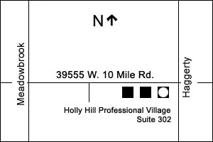 We are just west of Haggerty Road on the South side of Ten Mile Road in the Holly Hills Professional Village, a series of brown one-story offices. Our office is in the building closest to Haggerty Road and faces Ten Mile Road.